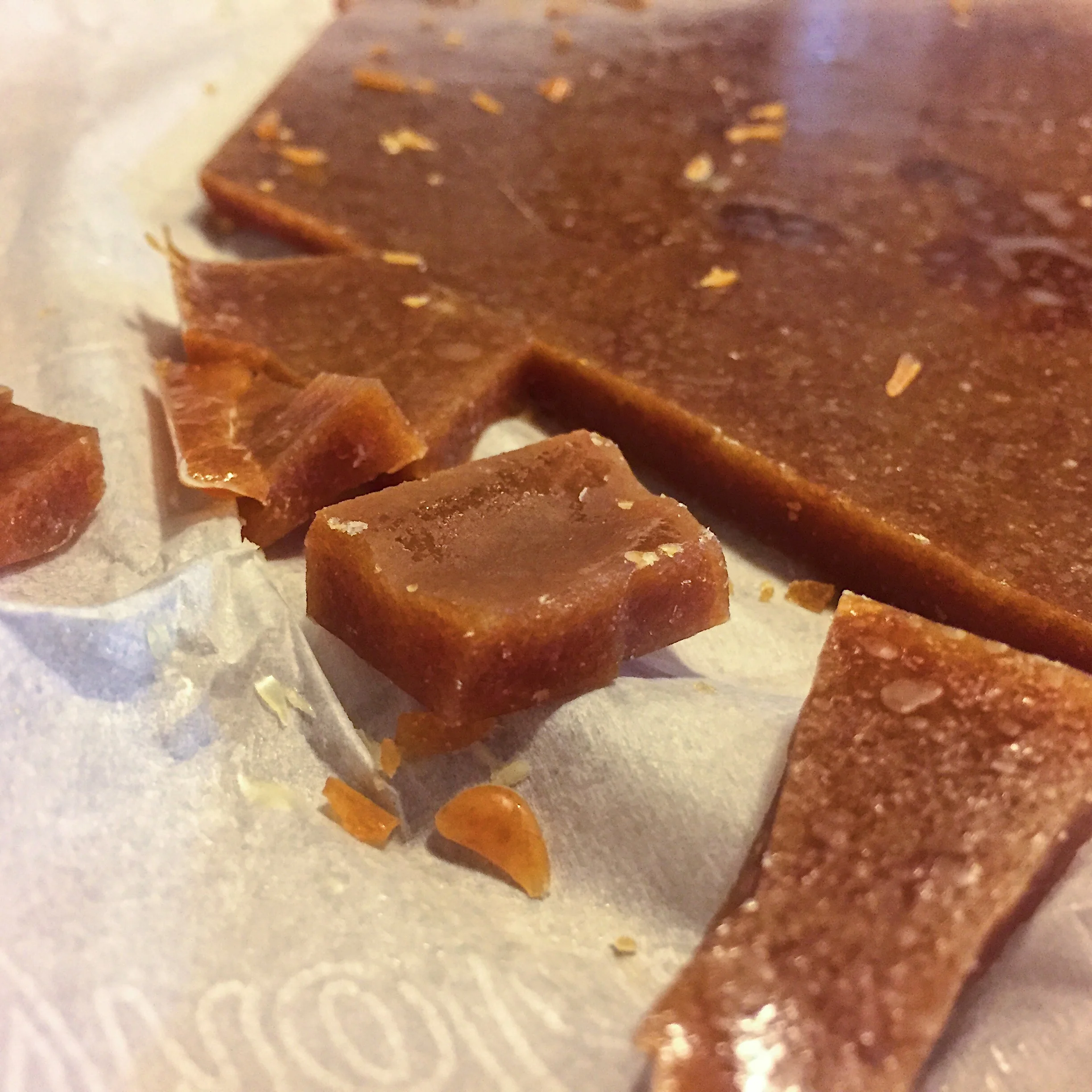 Remove from heat and add vanilla, gentle stirring with thermometer until just mixed. Pour into prepared baking pan. Let cool to room temperature before sprinkling sea salt on top. At this point you can place caramels in refrigerator for at least 3 hours before lifting parchment out of pan. Cut into small pieces and wrap individually. Can be stored in the fridge or on counter for a couple days for softer caramel. They don’t last much longer than a day or two in our house, so the counter works just fine for us!